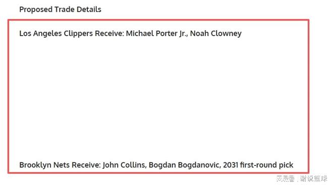 當(dāng)然除了快船以外,還有不少球隊(duì)陷入困局,比如東部的布魯克林籃網(wǎng)。所以媒體一向擅長(zhǎng)制造話題,就支招快船跟籃網(wǎng)商討交易,可以嘗試追求雙能鋒邁克爾-波特,方案里21歲內(nèi)線諾阿-克洛尼也來(lái)投,快船則需要送出約翰-科林斯、博格達(dá)諾維奇和一個(gè)來(lái)自2031年的首輪選秀權(quán)。