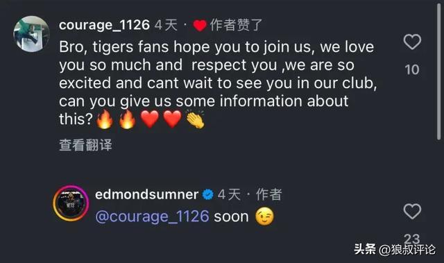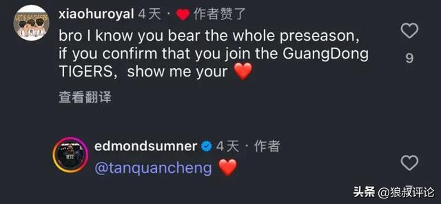 此前,薩姆納在社媒當中,回應廣東網友是否加盟廣東宏遠俱樂部的話題。