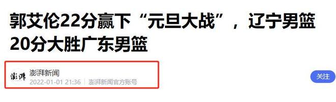 澎湃新聞|郭艾倫22分贏下“元旦大戰”,遼寧男籃20分大勝廣東男籃.2022
