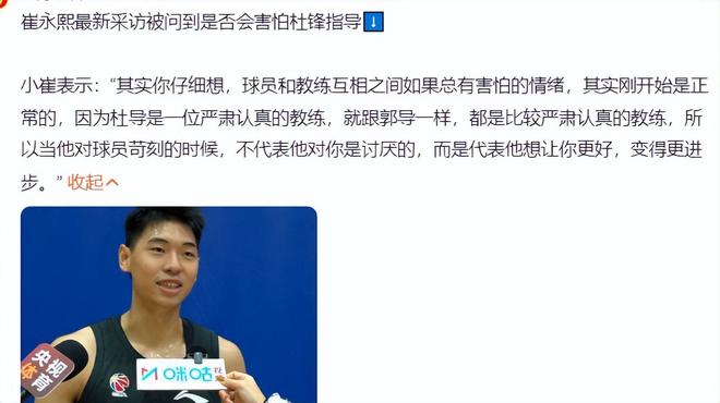 崔永熙也談到了杜鋒、楊瀚森等人的話題,但他最多的還是談自己身體情況,他表示自己會努力康復爭取趕上CBA新賽季的第一場比賽,他還表示一開始害怕杜鋒指導屬于正常情況。