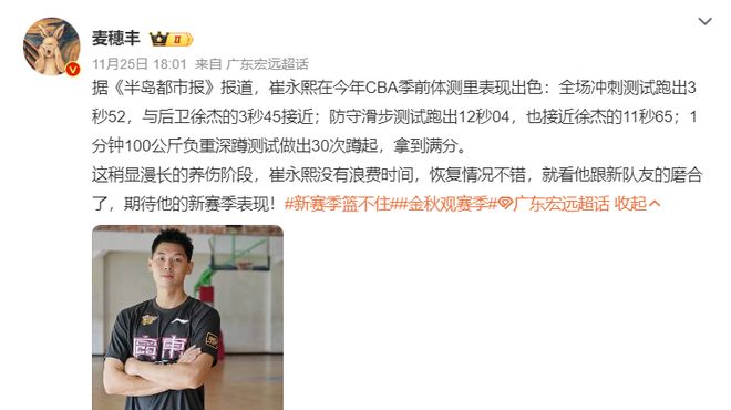 崔永熙在2024年12月12日遭遇了左膝前交叉韌帶撕裂大傷,隨后他被籃網隊裁掉,重返CBA后被廣州交易至廣東,還剩16天他就已經足足1年時間沒有打過正式比賽,一天之前他剛剛完成了CBA的體測。