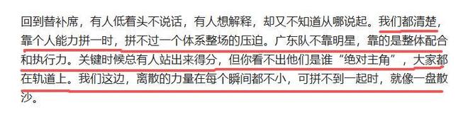作者直指四川隊一盤散沙。廣東隊不靠明星,靠的是整體配合和執行力。關鍵時候總有人站出來得分,但你看不出他們是誰“絕對主角”,大家都在軌道上。我們這邊,離散的力量在每個瞬間都不小,可拼不到一起時,就像一盤散沙。