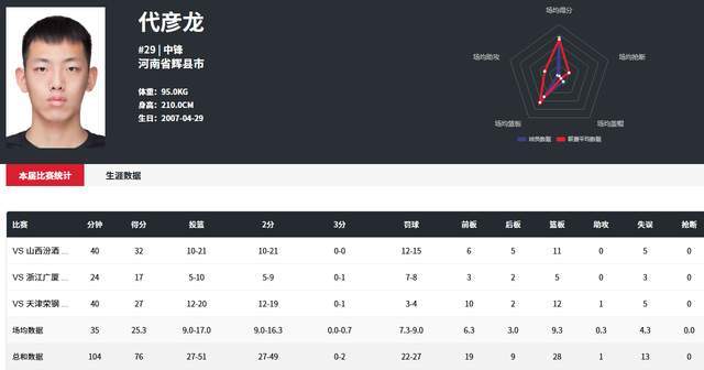 代彥龍打滿40分鐘,20投12中,拿到27分12籃板,徐子淏15投7中,拿到18分11籃板。