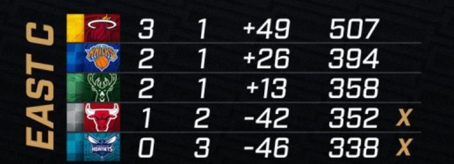 最后1場雄鹿VS尼克斯,雄鹿贏球,熱火第1晉級,雄鹿第2跟其他組比凈勝分;尼克斯贏球,尼克斯第1晉級,熱火第2跟其他組比凈勝分。