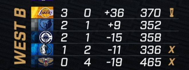 西部B組:湖人提前晉級,灰熊和快船最后1場正面交手,贏球的3勝1負小組第2,將和A組第2比較凈勝分。獨行俠、鵜鶘提前出局。