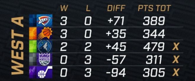 西部A組:雷霆太陽都是3勝0負,最后1場正面交手決出第1第2,第1晉級,第2將是3勝1負,與其他組第2比戰績。森林狼、國王、爵士出局。