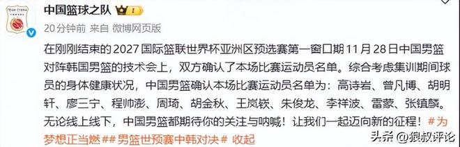北京時間11月27日,中國男籃官方公布世預賽對陣韓國隊的12人名單,與亞洲杯時期相比,趙睿,趙嘉義,王俊杰,余嘉豪缺席,新增張鎮麟,曾凡博,周琦,王嵐嵚。