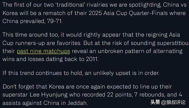 我們關注的兩個"傳統"對抗賽中的第一個是,中國對陣韓國,這將是對2025年亞洲杯四分之一決賽的重新對決,當時中國以79-71獲勝。