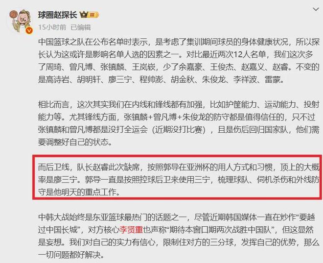 那么問題來了,誰能頂替趙睿?國內知名媒體人分析是擅長控球突破的廖三寧,這哥們在今年亞洲杯場均得到5.2分2.2板4.3助,投籃命中率只有30.4%,表現起伏不定。