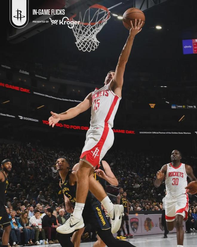 第三節最后時刻,又是他連得4分,最后那記突到籃下雙手暴扣扳平比分的一球,徹底將火箭的氣勢打了出來。