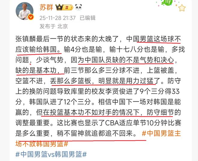 輸韓國4分!蘇群中肯點評,指出了中國男籃輸球的主要原因