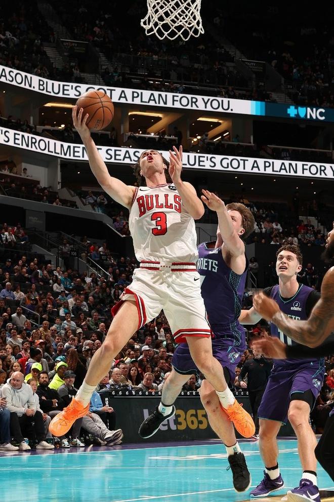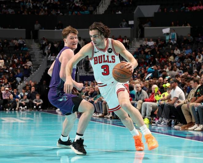 中場休息回來,公牛連續兩節單節轟下30+得分,且限制黃蜂本場首次單節不足30分。公牛被拉開67-76落后9分差距,公牛打出一波11-2攻勢追平比分,雙方之后交替領先纏斗,懷特與吉迪引領公牛逐步反超比分,公牛單節32-26凈勝6分,三節結束公牛94-93反超黃蜂1分。前三節比賽,公牛三分僅26中6,懷特23分與吉迪18+9+7,引領公牛5人得分上雙,黃蜂三分34中13,米勒5記三分25分、三球13+6+5與塞克斯頓16分。
