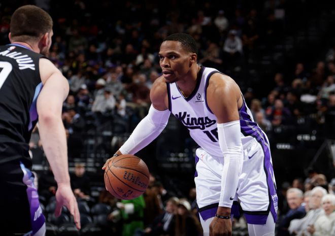 但是,有一個人沒擺爛:威少。常規賽開打前,威少才以1年360萬無保障底薪的合同簽約國王,國王隨時可以裁掉他。常規賽開打后,威少20場全勤(國王隊內全勤的就三人:威少+德羅贊+尤班克斯),場均14.4分7.2籃板6.8助攻,兩項命中率44%+39%。值得一提的是,威少的三分球產量(場均2.1記三分球)和效率均值,是國王隊內最高的。美媒特意統計了一下,本賽季當威少首發時,場均可以貢獻15.6分8.4籃板7.3助攻,三分球命中率42%!此外威少本賽季已經有過三次三雙,打勇士砍下23分16籃板10助攻。