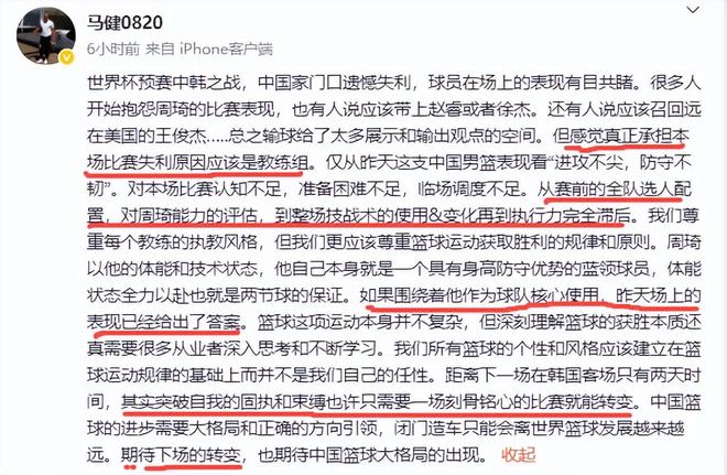 比賽結束的當晚,中國男籃名宿馬健發視頻表示了不滿,直言在家門口輸給韓國隊,真想動粗口。過了一晚馬健再次發文深刻解剖中國男籃,他直言教練組應該背鍋,不要抱怨周琦,也不要抱怨沒召徐杰,真正承擔本場比賽失利原因應該是教練組。
