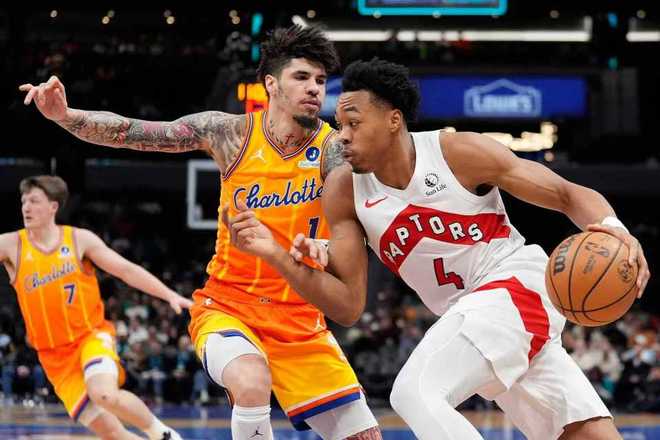 第四節比賽,猛龍三叉戟均是相繼得分20+,率領猛龍繼續擴大96-84領先優勢,猛龍之后繼續擴大100-88領先優勢。布里奇斯連得5分與麥克尼利上籃得分,塞克斯頓也三分命中,猛龍持續打鐵。詹姆斯補籃得分,黃蜂一波12-0攻勢追平比分,奎克利關鍵拋射打破猛龍得分荒。布里奇斯造犯規兩罰一中,巴恩斯被戰術犯規兩罰全中維持3分優勢,克尼佩爾命中扳平三分,英格拉姆絕殺不中,雙方常規時間104-104。