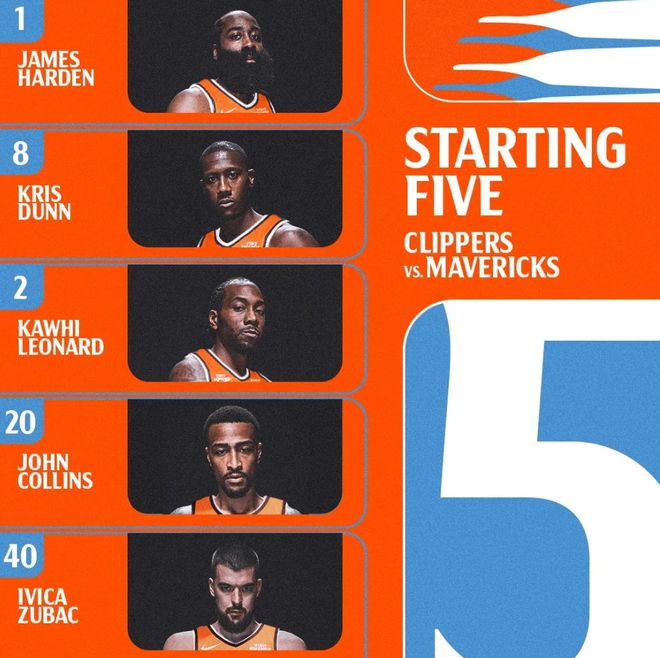首發陣容方面,快船隊這邊,倫納德背靠背繼續出戰,博格丹,喬丹-米勒缺席,泰倫盧排出的最新首發五人組為:哈登、鄧恩、倫納德、科林斯、祖巴茨;獨行俠這邊,安東尼-戴維斯(左小腿傷病管理)、丹尼爾-加福德(右腳踝傷病管理)和克萊-湯普森(左膝傷病管理)缺戰,PJ-華盛頓賽前熱身時意外扭到腳踝也退出比賽,首發陣容則為:馬紹爾、克里斯蒂、弗拉格、內姆哈德 、鮑威爾。