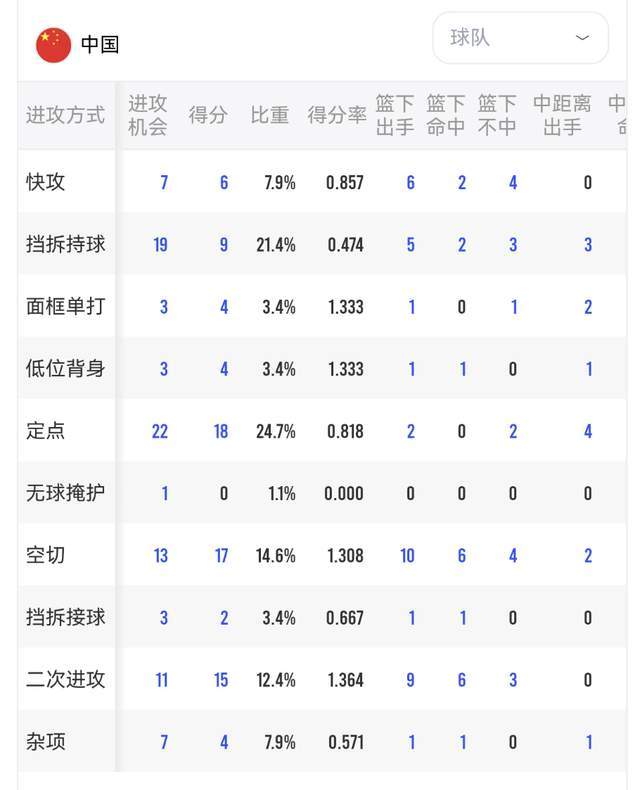 就擋拆持球來看,亞洲杯打了19次,世預(yù)賽13次。就低位背身來看,亞洲杯3次,世預(yù)賽9次。就定點進攻來看,亞洲杯22次,世預(yù)賽18次。就空切來看,亞洲杯13次,世預(yù)賽3次。就快攻來看,亞洲杯7次,世預(yù)賽21次。