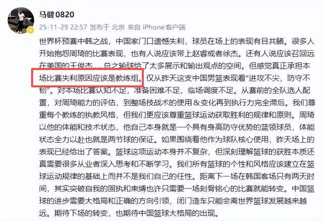 那么,中國男籃的問題,到底是出在哪里了呢?對此,中國男籃名宿馬健老師,在11月29日深夜23點,在社交平臺怒批球隊,矛頭直指教練組。