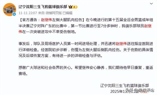 根據(jù)遼寧男籃官方的公示,在今晚進(jìn)行的第十五屆全運(yùn)會(huì)男籃成年組半決賽遼寧對(duì)陣廣東的比賽中,第一節(jié)比賽進(jìn)行至7分多鐘時(shí),我俱樂(lè)部球員趙繼偉在一次突破進(jìn)攻中不幸受傷倒地。
