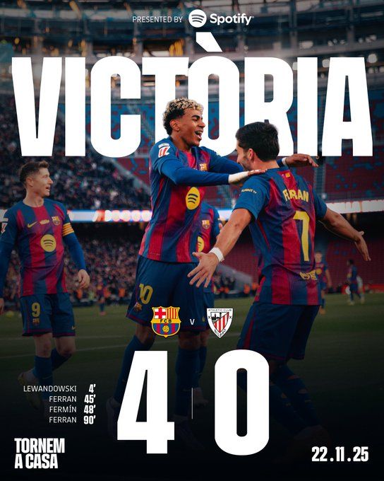 北京時間11月22日23:15,西甲聯賽第13輪,巴塞羅那重回諾坎普球場迎戰畢爾巴鄂競技。上半場萊萬破門,費蘭補時打進單刀球,巴薩暫2-0畢爾巴鄂競技;下半場費爾明破門,桑塞特直紅,比賽最后時刻亞馬爾助攻費蘭單刀再下一城,最終巴薩4-0十人畢爾巴鄂競技,回到諾坎普首戰開門紅,先賽積分追平皇馬。