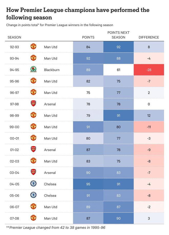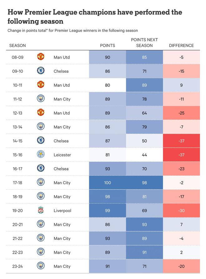 過去15個賽季里,自2010-11賽季安切洛蒂執教的切爾西開始,衛冕冠軍球隊的積分較上一賽季下滑至少10分的情況出現了9次。