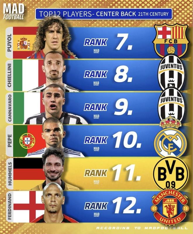 普約爾僅第7明顯偏低。他在巴薩與西班牙的雙核心地位、長期穩定性與大賽質量(歐冠+世界杯+歐洲杯)兼具,應進入前四的討論。費迪南德排到第12也偏低;英超統治期的后防組織、出球與閱讀比賽能力,使他至少應處于5–8名這一檔。