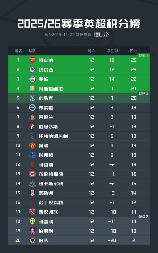 北京時(shí)間11月25日,2025/26賽季英超聯(lián)賽結(jié)束了第12輪的全部較量,積分榜的形勢(shì)也產(chǎn)生了進(jìn)一步的變化。