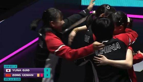 國際乒聯世青賽U19女團決賽,中國隊3比2驚險擊敗日本隊奪得冠軍。第一盤:縱歌曼2比3青木咲智;第二盤:覃予萱3比0小鹽悠菜;第三盤:姚睿軒3比0高森愛央;第四盤:覃予萱0比3青木咲智;第五盤:縱歌曼3比2小鹽悠菜。