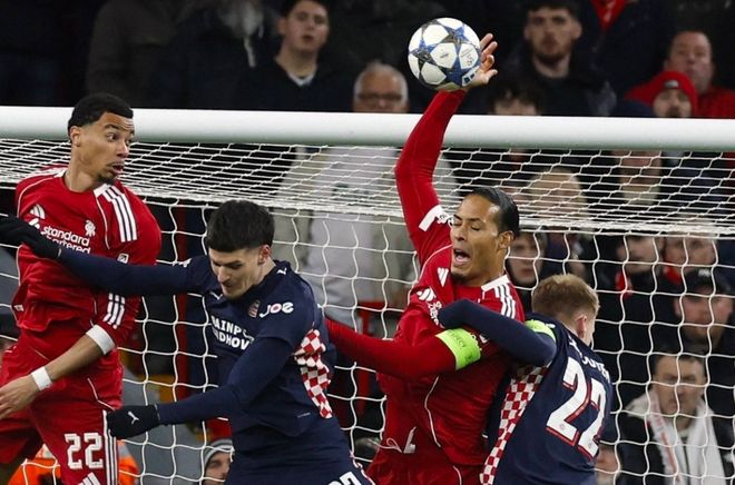第32分鐘,利物浦差一點進球。范戴克門前頭球攻門,結果皮球擊中橫梁彈出,差之毫厘。3分鐘后,埃基蒂克低射近角,門將迅速落地把球撲出。半場結束,雙方踢成1-1平手。利物浦上半場控球率67%,10次射門進了1球。而埃因霍溫上半場只有3次射門,同樣打進1球。