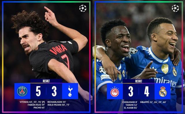 另一邊,上賽季歐冠冠軍巴黎迎戰熱刺。維蒂尼亞上演帽子戲法,法比安、帕喬和穆阿尼進球,里沙利松首開紀錄和穆阿尼梅開二度,最終巴黎主場5-3取勝積12分排在第2,熱刺積8分位列第16。