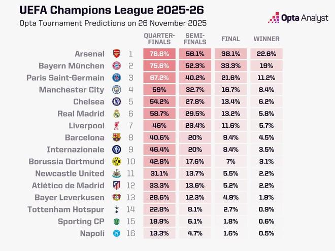 在歐冠聯賽階段前5輪戰罷,Opta更新了超級計算機預測的歐冠奪冠概率,阿森納22.6%領跑,拜仁19%位列第二,巴黎第三。