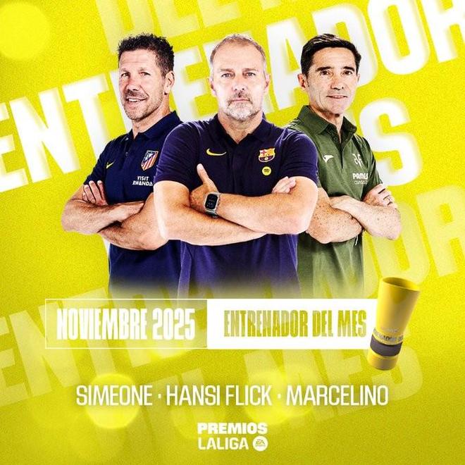 官方消息,西甲11月最佳主教練候選名單公布,分別是弗里克、西蒙尼和馬塞利諾。