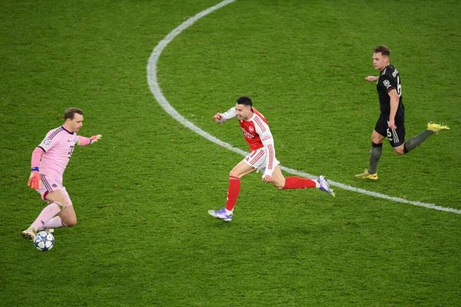 盡管6分鐘后特羅薩德因傷退賽,但阿森納下半場表現(xiàn)堪稱完美。阿爾特塔的換人立竿見影,第68分鐘卡拉菲奧里、馬丁內(nèi)利出場,1分鐘后意大利右后衛(wèi)前插禁區(qū)下底傳中,助攻馬杜埃凱再次領(lǐng)先。第76分鐘諾伊爾沖出禁區(qū)攔截馬丁內(nèi)利的單刀球撲空,阿森納主場3比1終結(jié)拜仁賽季18場不敗,以近乎完美表現(xiàn)登頂歐冠。18天內(nèi),諾伊爾兩次致命失誤,先后斷送了拜仁賽季16場連勝和18場不敗兩大紀(jì)錄。而諾伊爾職業(yè)生涯歐冠10次失誤導(dǎo)致失球,高達4次是在阿森納客場。