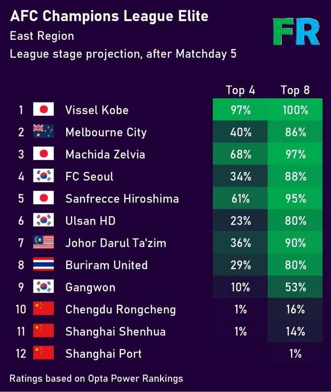 最新出爐的晉級排行榜(上圖)顯示,剛剛擊敗申花的神戶勝利船已經100%確定可以晉級到亞冠16強,全部東亞區12支球隊的晉級排名從高到低依次為:神戶勝利船、町田澤維亞、廣島三箭、柔佛新山、首爾FC、墨爾本城、蔚山現代、武里南聯、江源FC、成都蓉城、上海申花、上海海港。