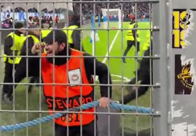 馬賽在2-1戰勝紐卡后,現場一客隊看臺前的保安難掩喜悅之情,對紐卡球迷接連做擦眼淚動作,并搖動護欄上的繩索,不時拍胸慶祝、仰面微笑。