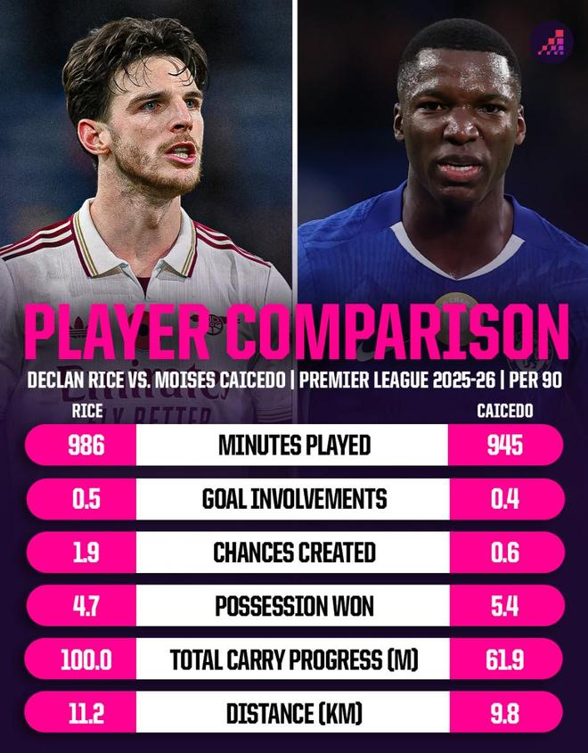 德克蘭-賴斯、凱塞多本賽季英超每90分鐘數據對比