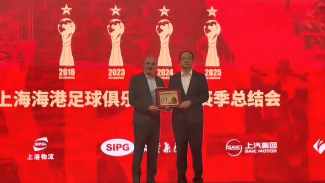 老帥和眾弟子背后是主臺的屏幕,上方赫然印著10個大字,寫著:海港三連冠,四星耀申城。眾所周知,本賽季奪取中超冠軍后,海港完成連續(xù)3年奪冠的”偉業(yè)“,讓俱樂部隊史的中超冠軍數(shù)量達到4個。如此榮譽的時刻,讓上港人倍感自豪。