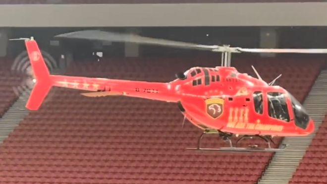 慶典最激動人心的時刻出現(xiàn)在直升機送火神杯環(huán)節(jié)。從視頻中看到,一架直升機突然盤旋在現(xiàn)場的上空,然后徐徐降落在現(xiàn)場中央。