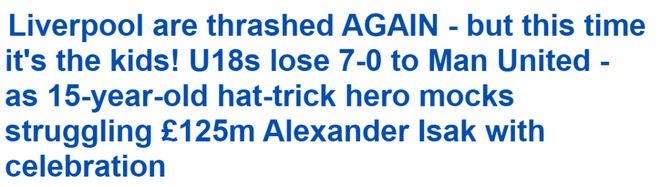 利物浦青年隊則只排在第9位。他們對慘敗并不陌生,他們的U16梯隊曾3-14大敗于阿森納腳下,目前效力曼聯的17歲丹麥中鋒奇多·奧比單場打入10球一戰成名。