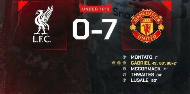 曼聯18歲以下青年隊周六大獲全勝,在青訓級別的「雙紅會」客場7-0大勝利物浦。上個月才滿15歲的英格蘭天才少年加布里埃爾(JJ Gabriel)完成帽子戲法,其中包括兩粒個人表演般的進球。加布里埃爾本周參加了魯本·阿莫林的一線隊訓練,但他本賽季肯定無法參加英超。