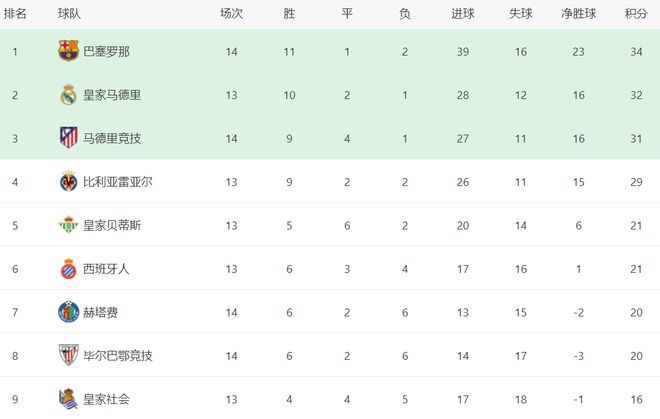 在積分榜上,巴薩以34分排名榜首。而32分的皇馬掉到第2名。馬競贏球之后,總積分達(dá)到31分,升到第3名。前3的最大分差只有3分,競爭白熱化。不過,皇馬比巴薩和馬競少踢1場。如果接下來與赫羅納的比賽獲勝,皇馬就能夠重登榜首位置。比利亞雷亞爾以29分排名第4。第5的是皇家貝蒂斯,拿到21分。西班牙人也是21分,排名第6。